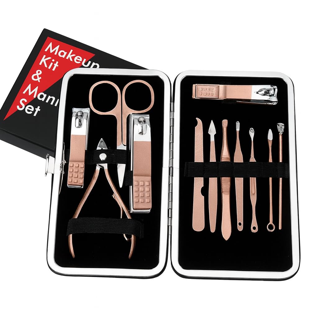 أدوات العناية بالأظافر، أدوات تجميل من الفولاذ المقاوم للصدأ لتقليم الأظافر والعناية بالأقدام وتشذيب الحواجب مع حافظة جلدية للسفر والاستخدام المنزلي، مجموعة من 12 قطعة