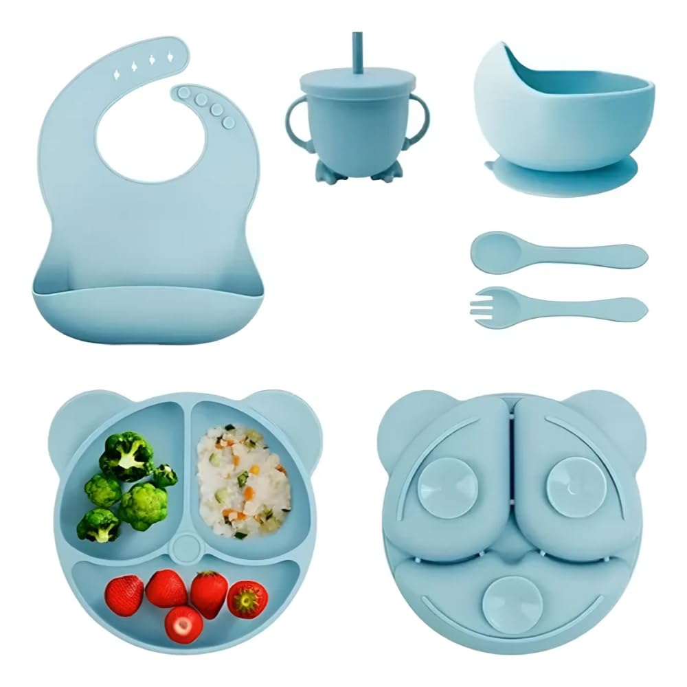 أدوات تغذية الأطفال من السيليكون، مستلزمات الفطام، تتضمن أكواب شفط وأطباق مقسمة، مريلة قابلة للتعديل، أدوات طعام للأطفال، ملاعق وشوك، كوب من فانتاستيك كيدز تويز، 6 قطع (باندا لارج (L) – أزرق)