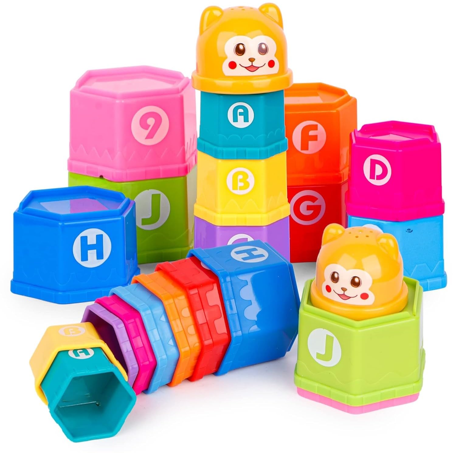 مجموعة الأكواب الملونة هذه هي اللعبة التعليمية المثالية للأطفال الصغار والرضع. تتميز بتصميم رأس دب مبهج في الأعلى، يأتي كل كوب في مجموعة متنوعة من الألوان الزاهية التي ستجذب انتباه طفلك الصغير.