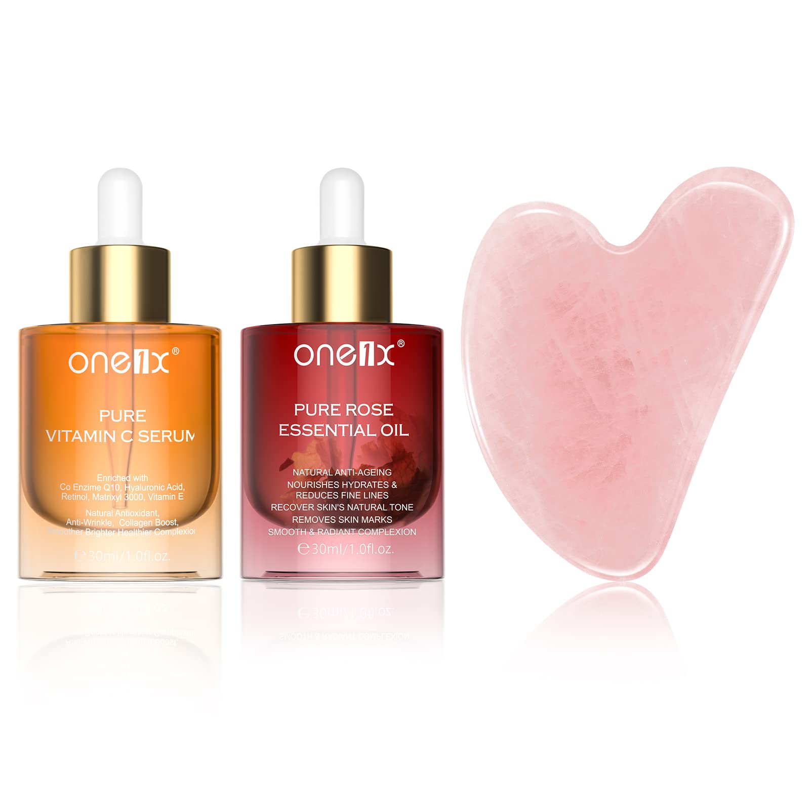 ادوات تدليك جوا شا وزيت الورد وسيروم فيتامين سي في مجموعة واحدة لتدليك الوجه وزيت وسيروم الوجه ومجموعة جوا شا المضادة للشيخوخة والتجاعيد والبقع الداكنة للعناية بالبشرة للنساء