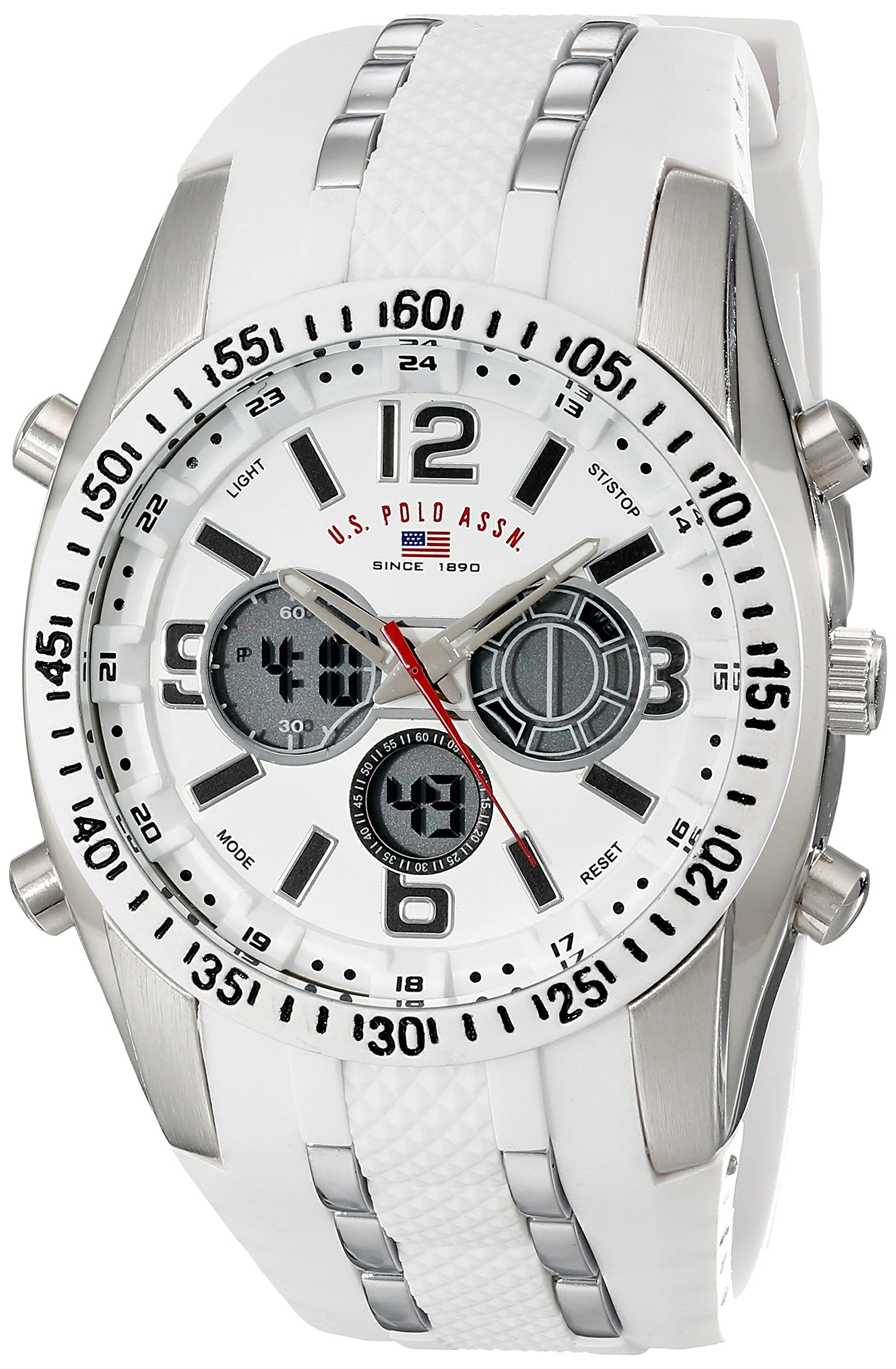 ساعة تناظرية رقمية من يو اس بولو بسوار أبيض مطاطي. يتيح الهيكل الدائري الكبير معرفة الوقت بسهولة. ساعة عملية كاجوال يمكن ارتداؤها مع ملابسك اليومية.