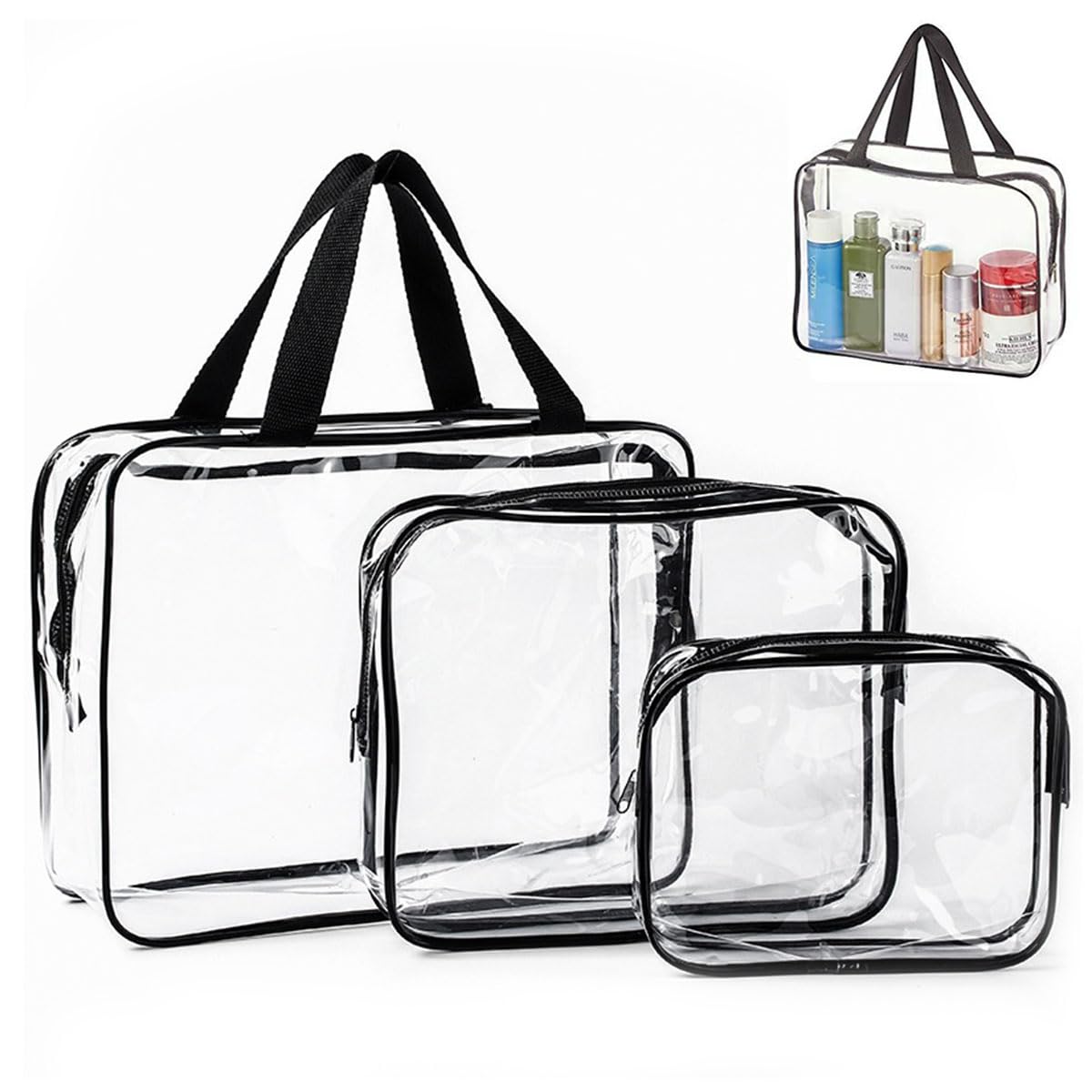 اي سي في 3 قطع من حقائب المكياج الشفافة للسفر مقاومة للماء بلاستيك PVC حقيبة مستحضرات التجميل مع سحاب اغلاق ومقبض ادوات الزينة للنساء والرجال اسود