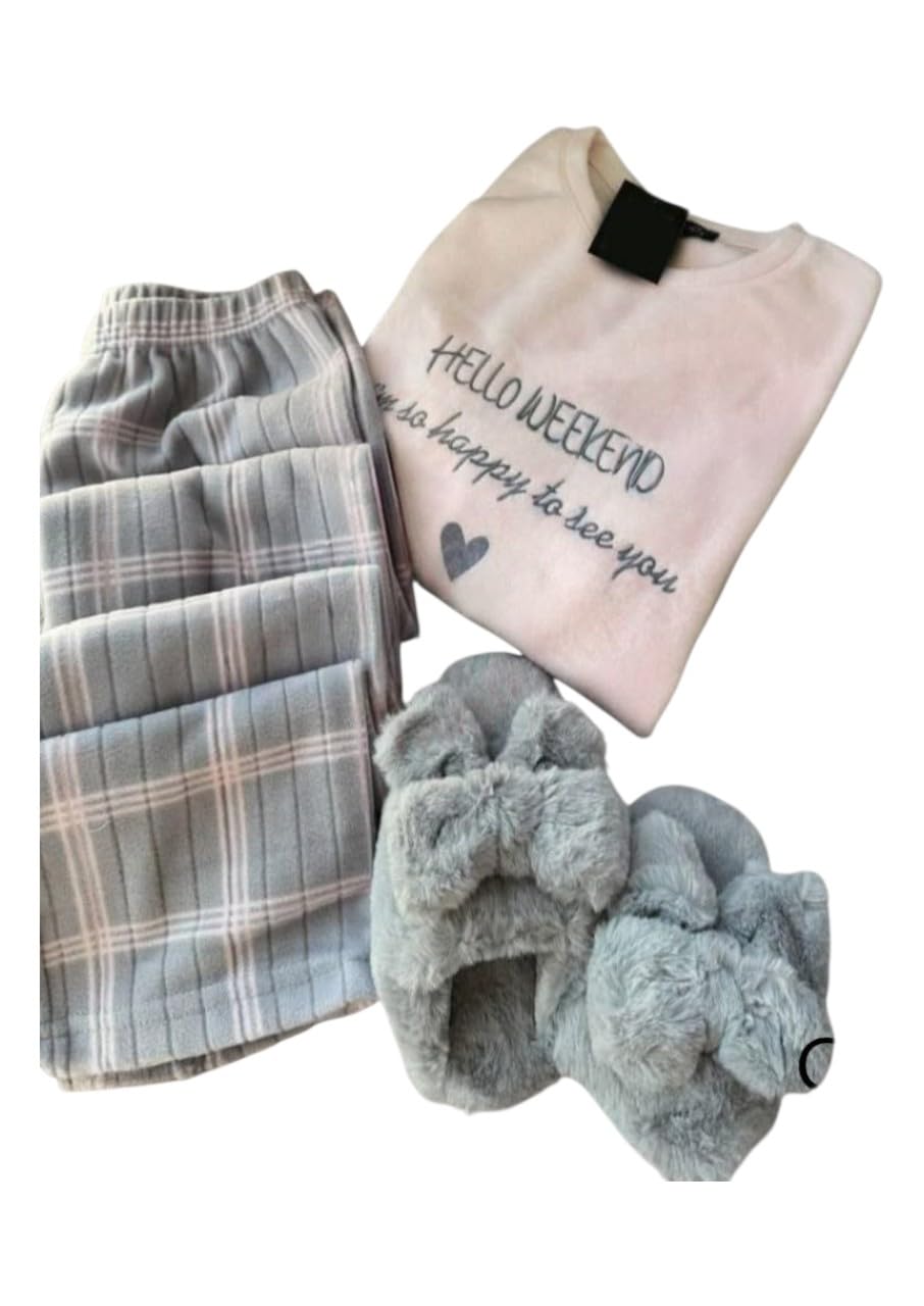 بجامه حريمى شتوى خامة قطيفه هايدى وشين، تيشيرت وردي مع بنطلون كاروهات رمادي تلبيس من 60 الى 85 كيلو