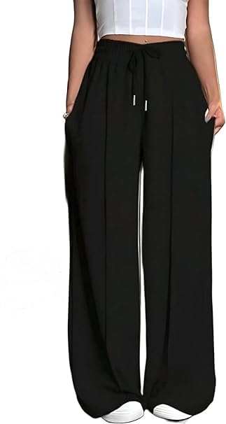 بنطلون نسائي واسع الارجل بخصر مرتفع باستيک ورباط بجيوب جانبية مريح وانيق للمنزل والخروج