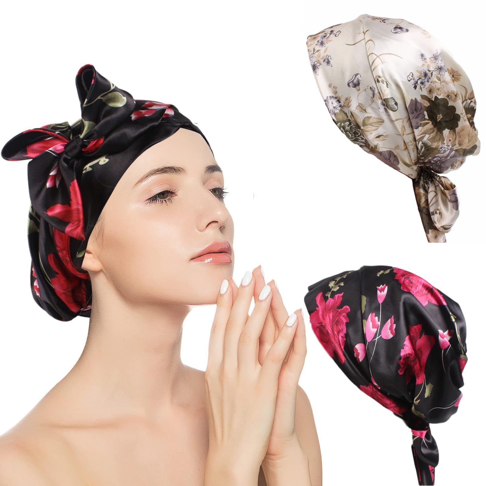 بونيه ساتان مع ربطة عنق من بوشين، غطاء شعر حريري بنمط زهور انيق، غطاء شعر حريري لكاب النوم مع اشرطة – قبعة ليلية حريرية للبنات والنساء (2 قطعة نمط 1)