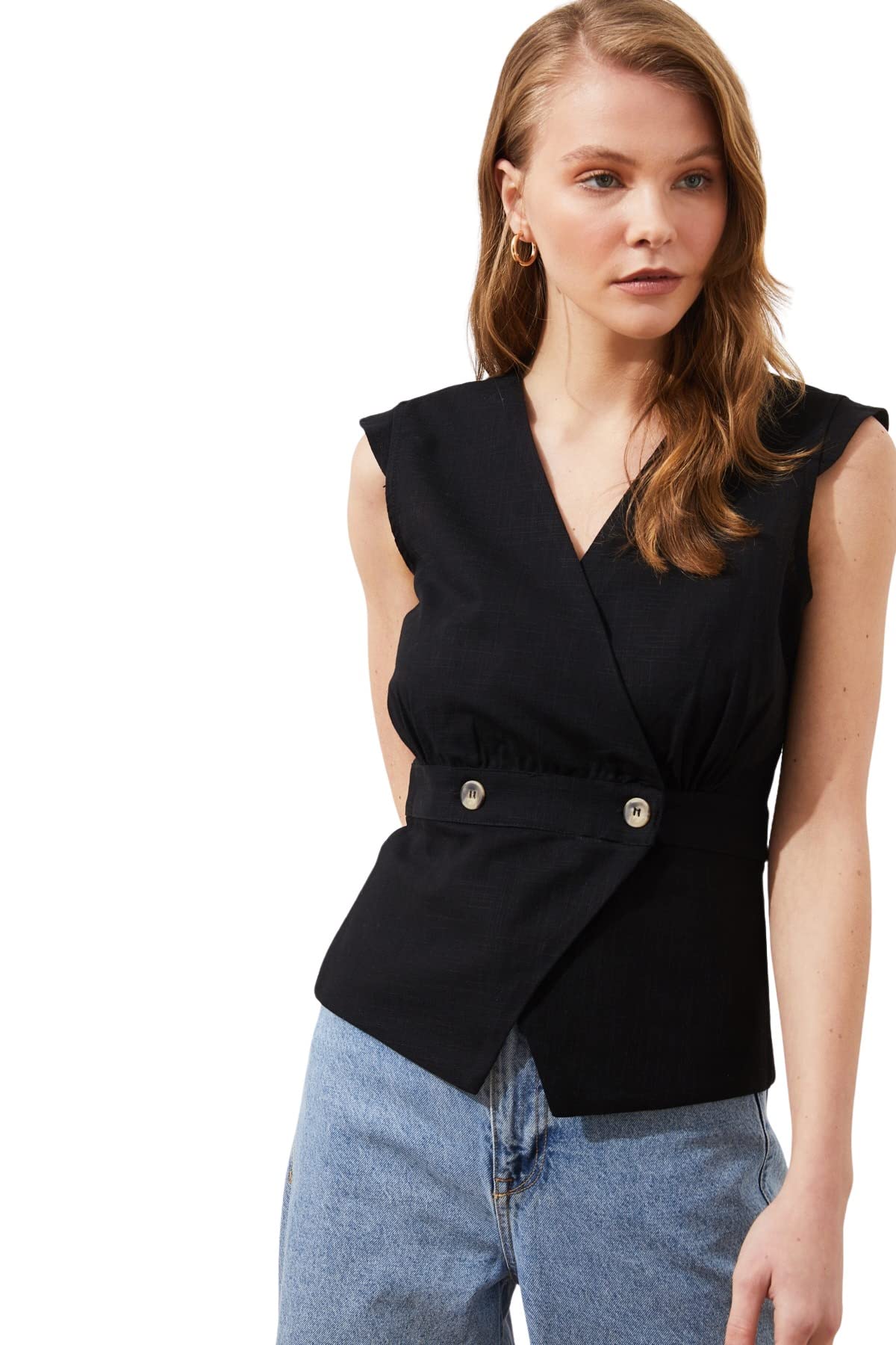 ترنديول بلوزة منسوجة مزدوجة الصدر بتفاصيل عظمة سوداء للنساء TWOSS20BZ0707 (عبوة من قطعة واحدة)