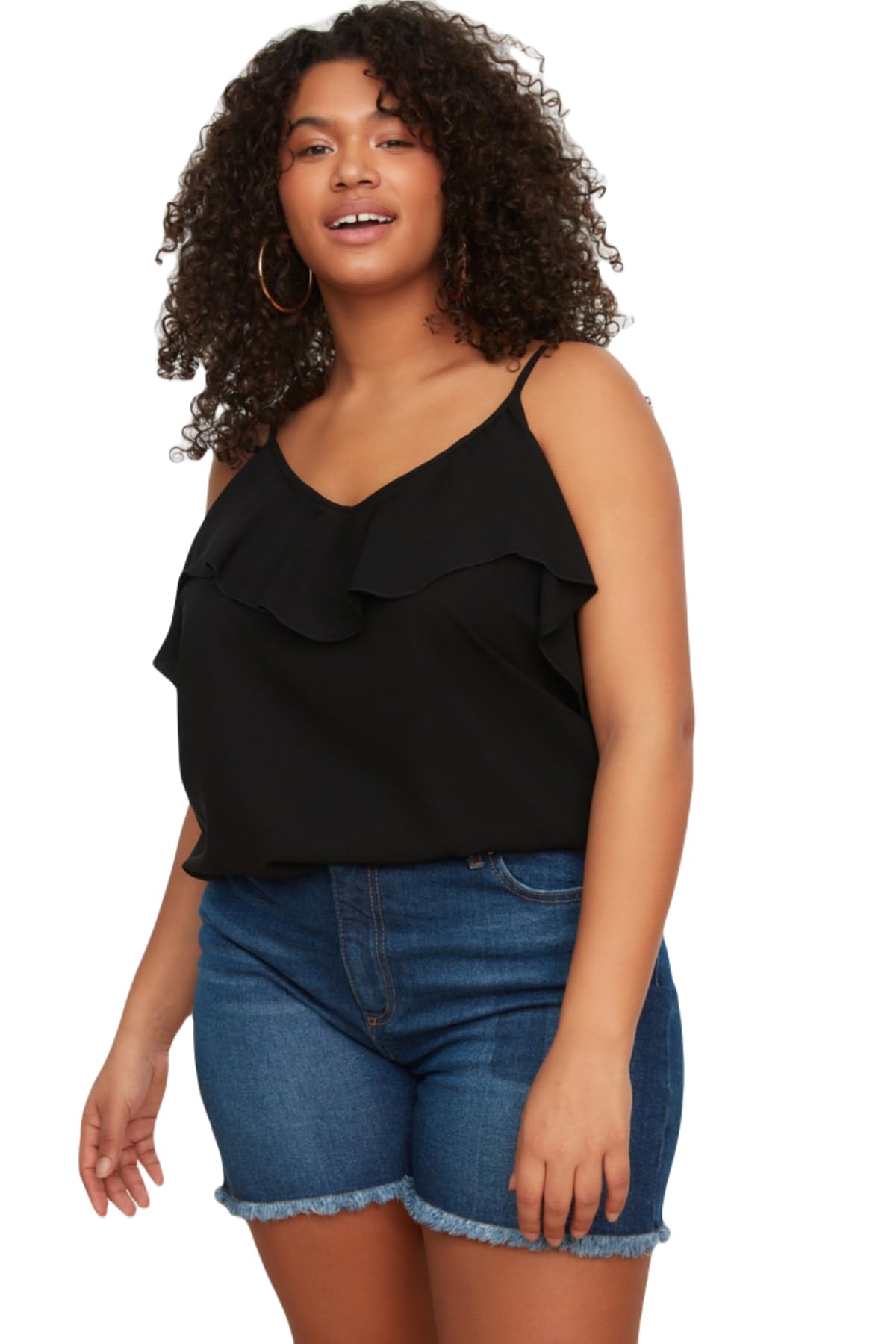 ترنديول بلوزة نسائية سوداء بحزام قابل للتعديل وياقة مكشكشة مقاس كبير TBBSS22AF0023 (عبوة من قطعة واحدة)