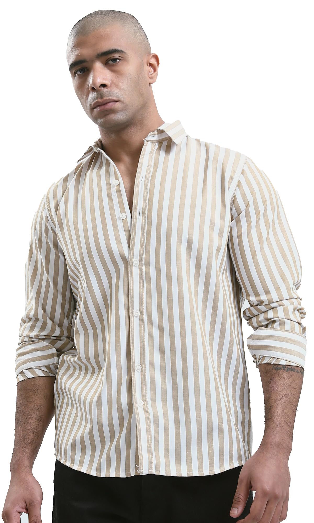 تيشرت عصري بأكمام طويلة وأزرار كاملة للرجال من ريفين، بلون بيج فاتح وأبيض
