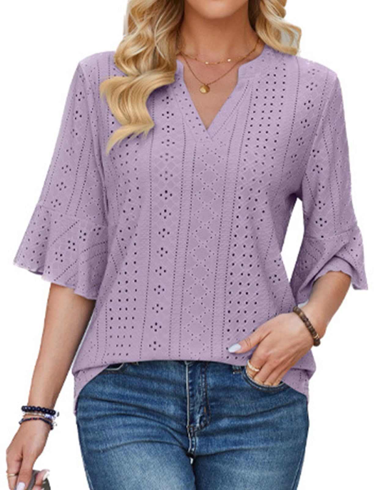 تي شيرت فضفاض برقبة على شكل حرف V وأكمام مكشكشة بطول 3/4 للنساء من سثكسيفيث