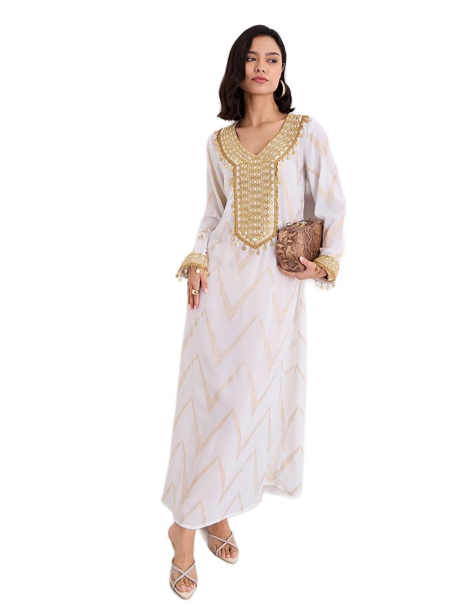 جلابية بطبعة شيفرون من الرقائق المعدنية مع تطريز ذهبي للنساء من ستايلي