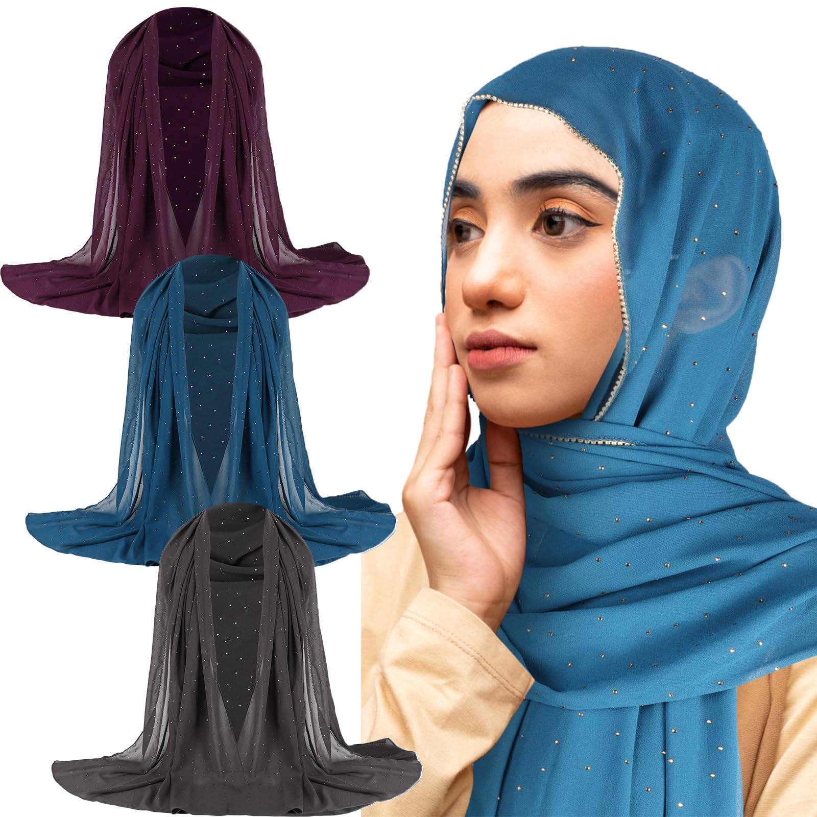 حجاب اسلامي مرصع باحجار الراين للنساء من 3 قطع – وشاح طويل، شال لف للراس، قماش ناعم جيد التهوية، الوان عصرية رمادي داكن، ازرق سيان، ارجواني، مناسب لمختلف المناسبات (29.5 × 71 انش)