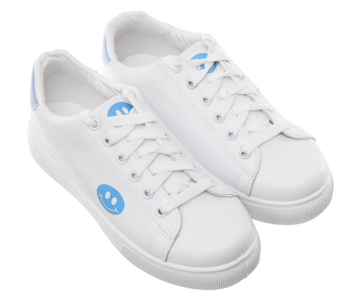 حذاء رياضي مسطح من الجلد برباط للنساء 99.99 يتميز بطباعة وجه مبتسم على الجانب (ابيض/ازرق، 39)