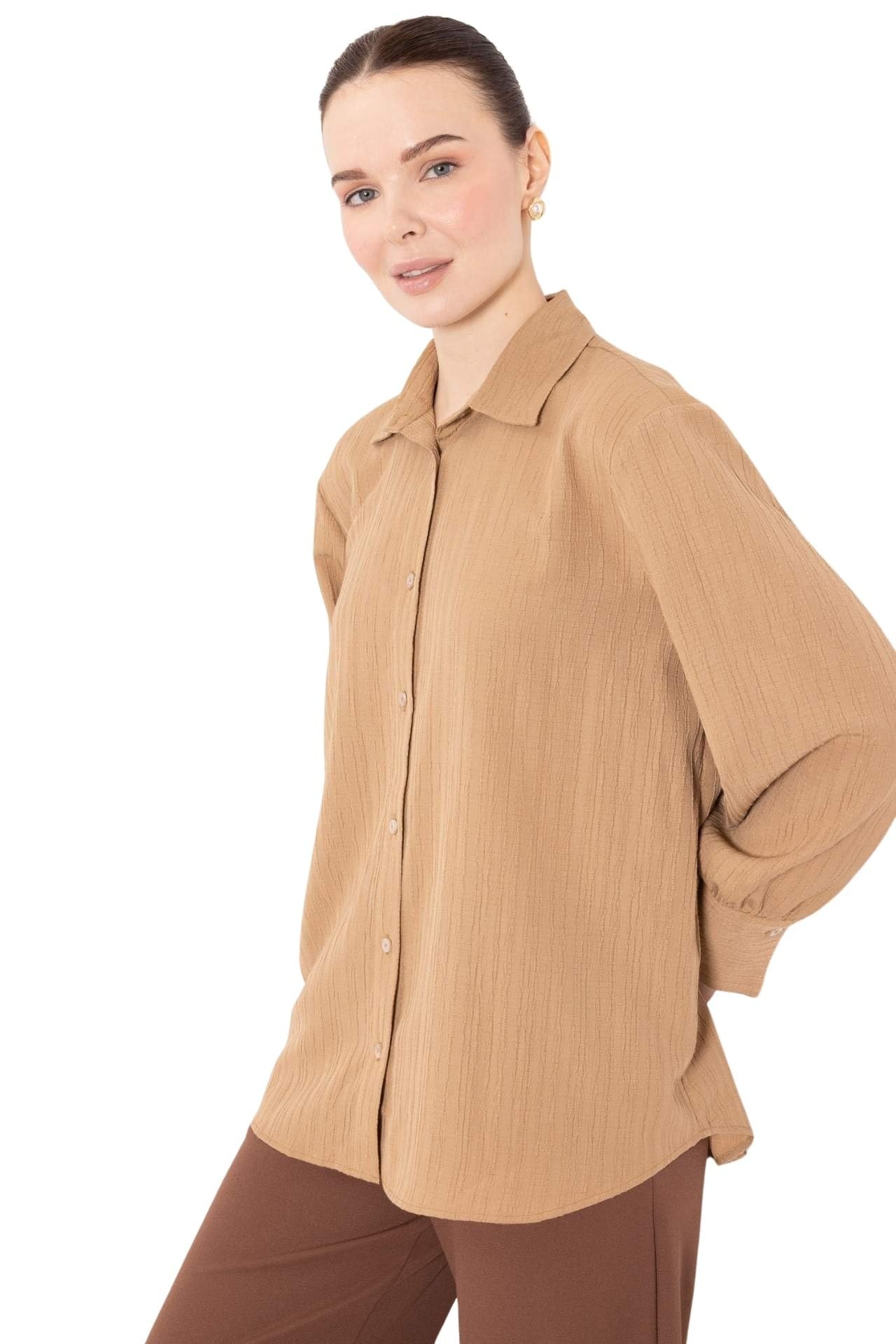 ديفاكتو بلوزة نسائية تقليدية بقصة عادية ورقبة قميص واكمام طويلة منسوجة واكمام طويلة، لون جملي فاتح، مقاس XXL