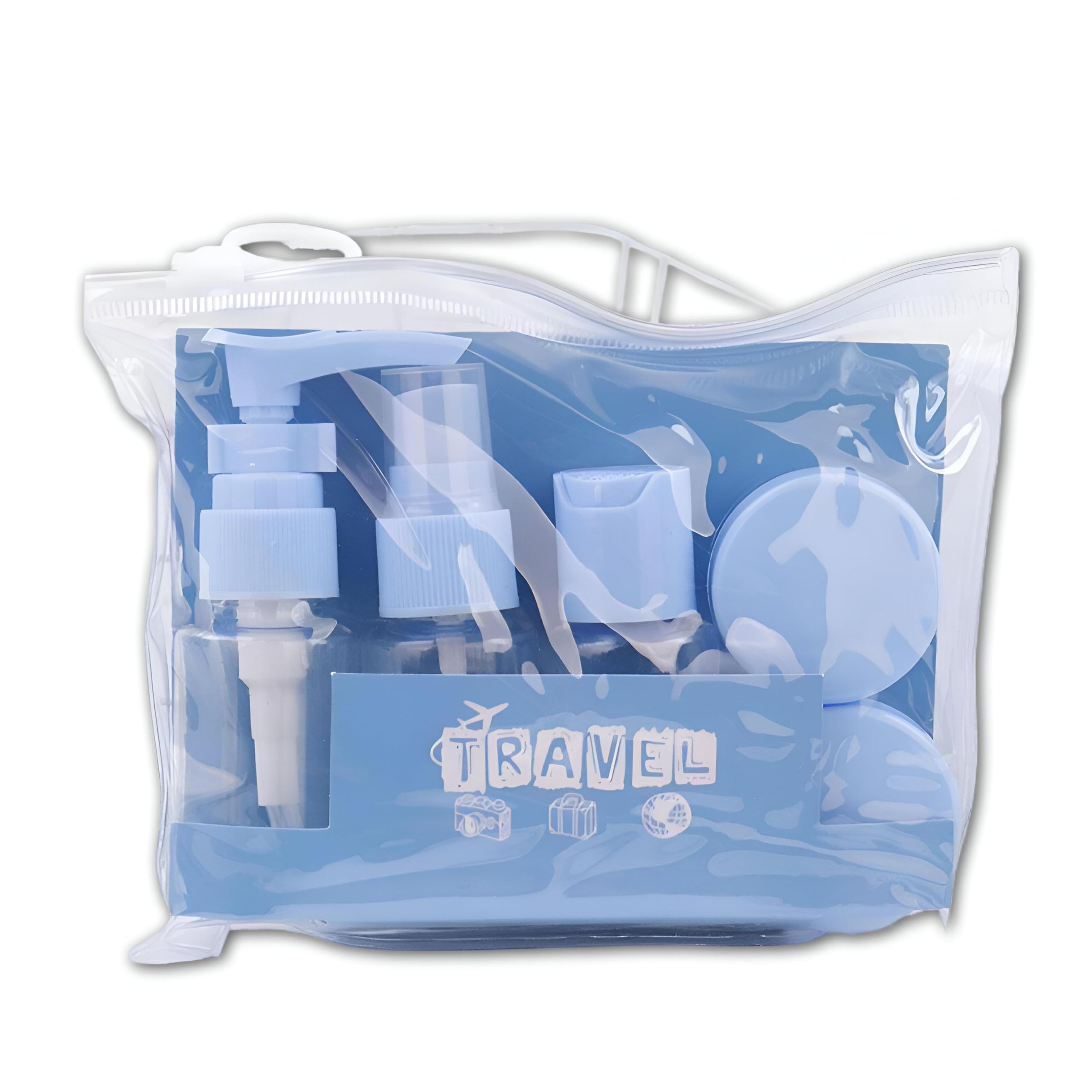 زجاجات سفر بلاستيكية صغيرة وفارغة قابلة لإعادة التعبئة من 5 قطع بخاخة وعلبة للكريم وموزعات تعمل بالضغط بحجم مناسب للسفر لمنتجات العناية الشخصية مع كيس تخزين شفاف (اللون: أزرق)