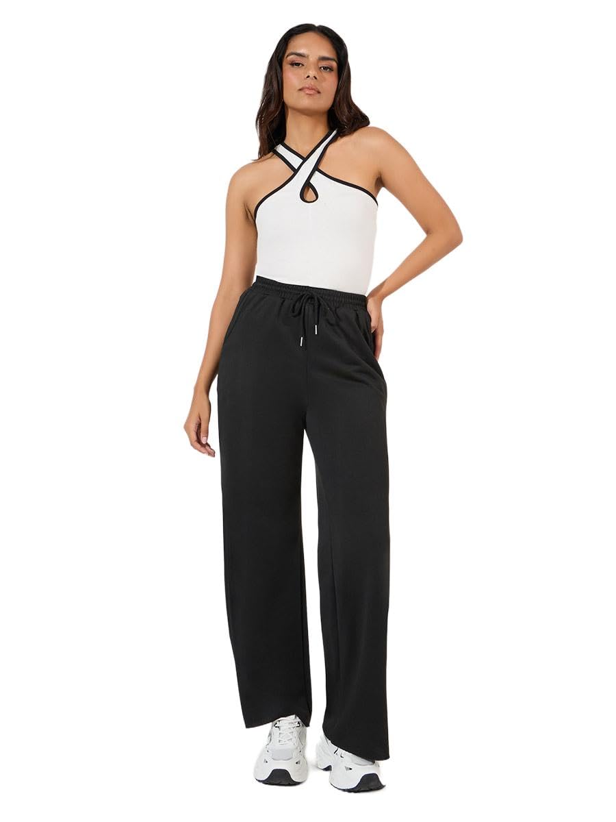 سروال رياضي بلون موحد وأرجل واسعة مع رباط خصر للنساء من ستايلي