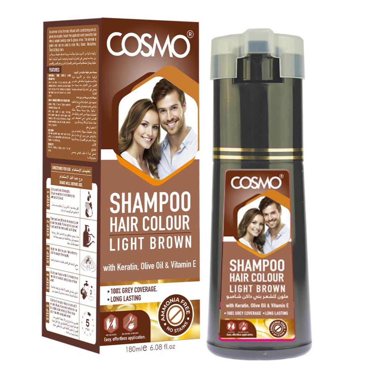 للحصول على لمسة ناعمة وطبيعية، شامبو صبغة الشعر باللون البني الفاتح يعزز الشعر بدفء وأبعاد خفيفة. توفر تركيبته اللطيفة تغطية كاملة مع ترطيب وتغذية كل خصلة. مثالي لأولئك الذين يبحثون عن مظهر دافئ وبسيط، هذا الشامبو يترك الشعر يبدو متألقًا وصحيًا بشكل طبيعي. احصلي على لون شعر بجودة صالونات التجميل في المنزل مع شامبو صبغة الشعر كوزمو. تركيبة من الكيراتين وزيت الزيتون وفيتامين E، يوفر شامبو صبغة الشعر المبتكر هذا تغطية رمادية بنسبة 100% مع تغذية شعرك بعمق. خالية من الأمونيا ومصممة للاستخدام بدون بقع، تقدم كوزمو حلاً خاليًا من الفوضى وسهل الاستخدام يوفر لونًا نابضًا بالحياة يدوم طويلاً وشعر أكثر صحة مع كل استخدام.