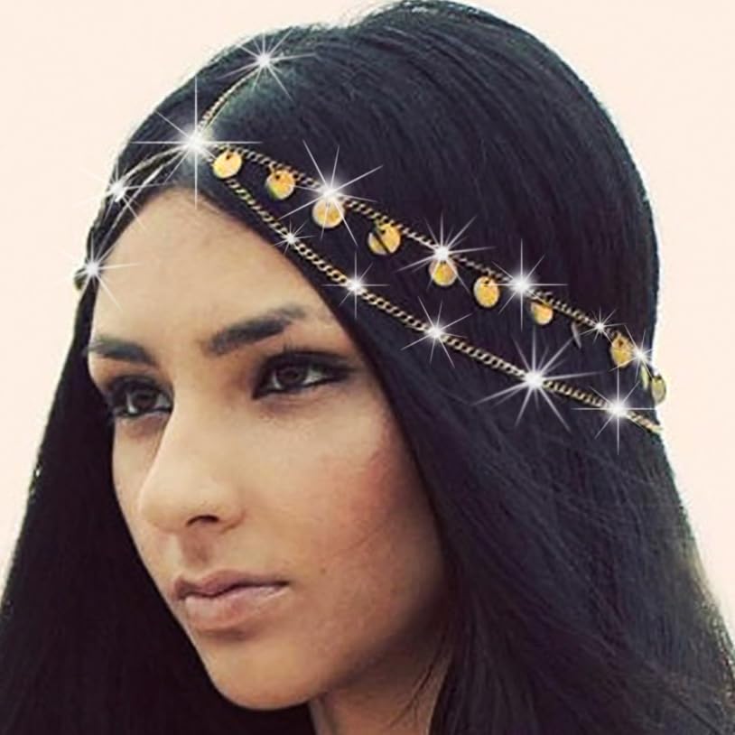 شريط راس بسلسلة شعر، عصابات راس بوهو مرصعة بالترتر، اكسسوارات شعر ذهبية للنساء للربيع والصيف