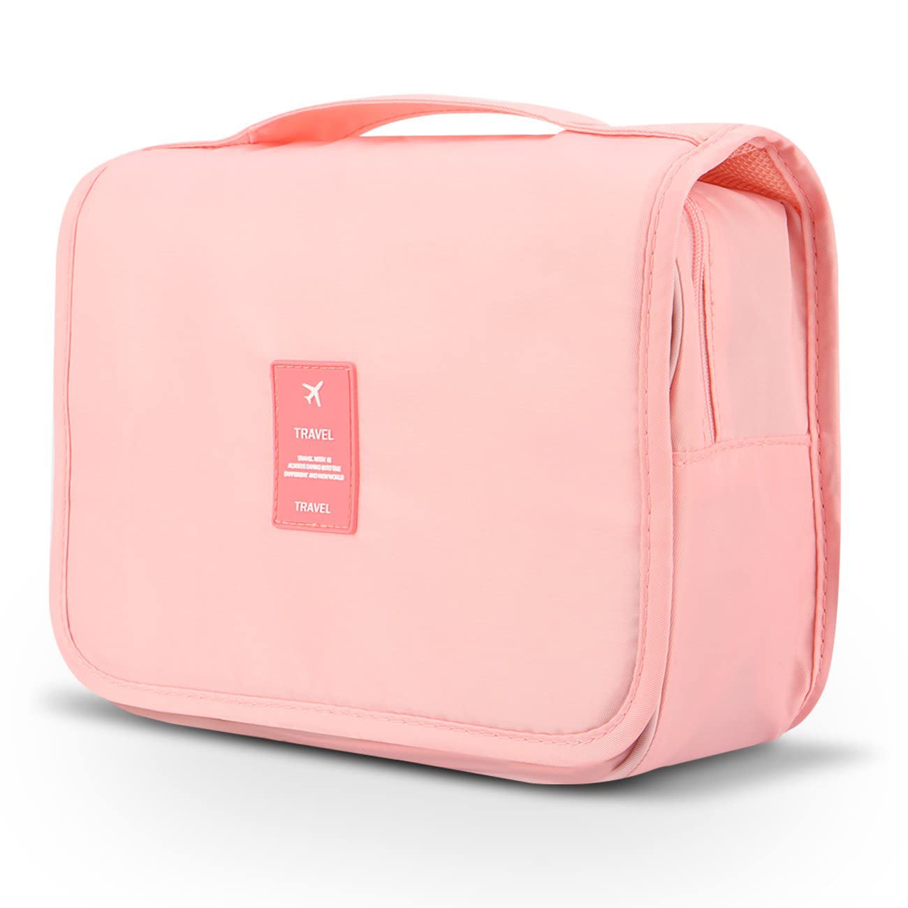 شنطة أدوات الزينة للنساء من ويزو، شنطة مكياج معلقة للسفر مع مساحات تخزين متعددة وشماعة، شنطة أدوات الزينة والإكسسوارات ومستحضرات التجميل والزجاجات وأدوات العناية الشخصية، تصميم عصري بسيط، بينك