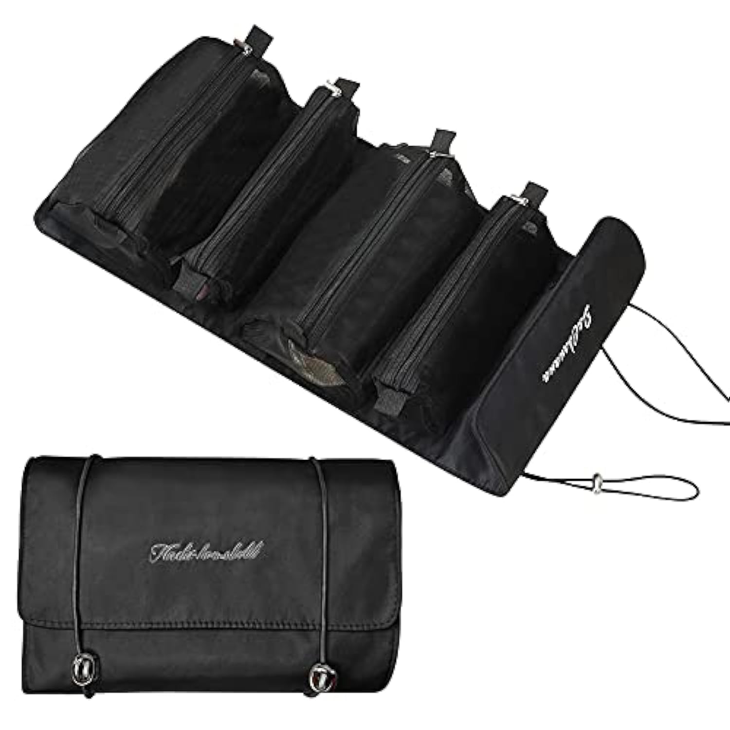 شنطة مكياج ومستحضرات تجميل للسفر بتصميم 4 في 1 مقاومة للماء وقابلة للطي ومحمولة وصغيرة الحجم للإزالة للنساء والبنات من ال اي تي أسود مادة صناعية