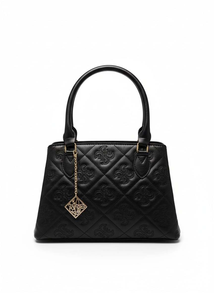 شنطة يد جلد صناعي مستورد للنساء مع ميدالية تتميز بنمط إسلامي، لون أسود، مقاس 30 × 25 سم.