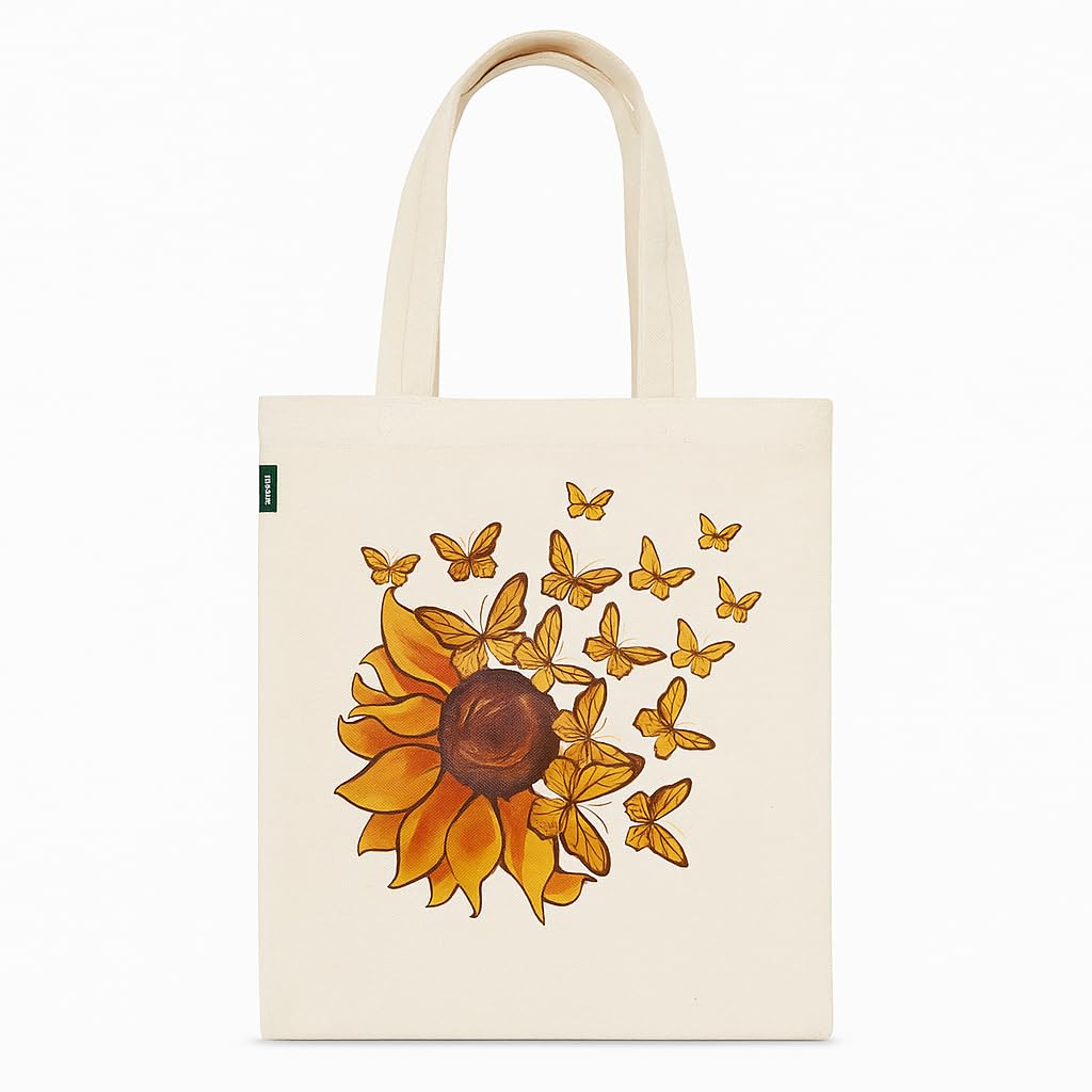 شنطة يد كبيرة توت انيقة بتصميم زهرة عباد الشمس والفراشة – خفيفة الوزن وقابلة لاعادة الاستخدام وصديقة للبيئة للنساء والفتيات والتسوق والسفر والاستخدام اليومي لون بيج