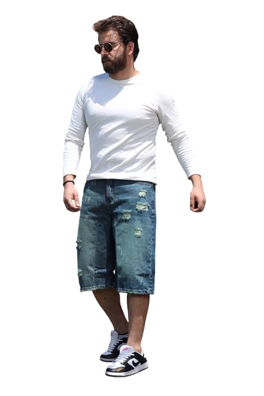 شورت جينز بأرجل واسعة للرجال، لون أزرق زيتي