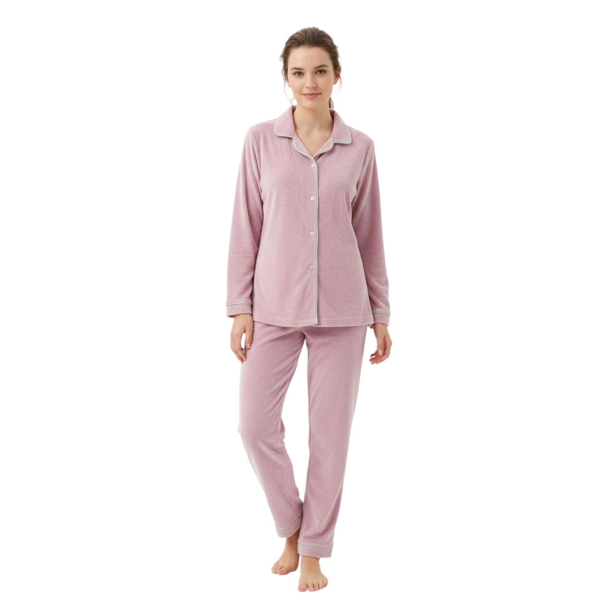 تم تصميم طقم البيجامة الشتوي الكلاسيكي للنساء لتوفير الدفء والراحة والأناقة الخالدة. مصنوعة من المخمل المخطط الناعم (قماش قطيفة)، مما يوفر شعورًا مريحًا مع الحفاظ على لطيفًا على البشرة. التصميم الكلاسيكي يجعلها مناسبة للارتداء المنزلي اليومي، سواء للنوم أو الاسترخاء في المنزل أثناء الطقس البارد. مع مقاس مريح، يضمن طقم البيجامة هذا سهولة الحركة وراحة طويلة الأمد طوال فصل الشتاء. اختيار مثالي للنساء اللواتي يبحثن عن ملابس منزلية شتوية أنيقة وعملية ودافئة.