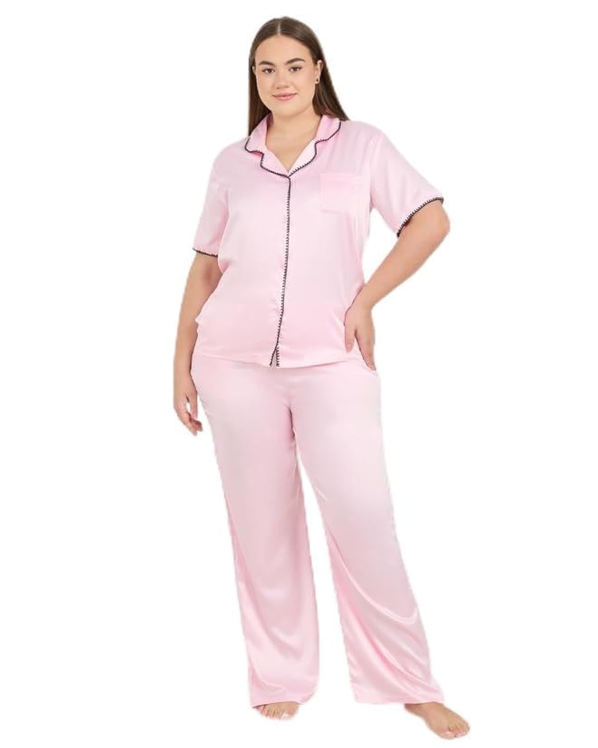طقم بيجامة مكون من قميص ساتان بخياطة متباينة للنساء من ستايلي