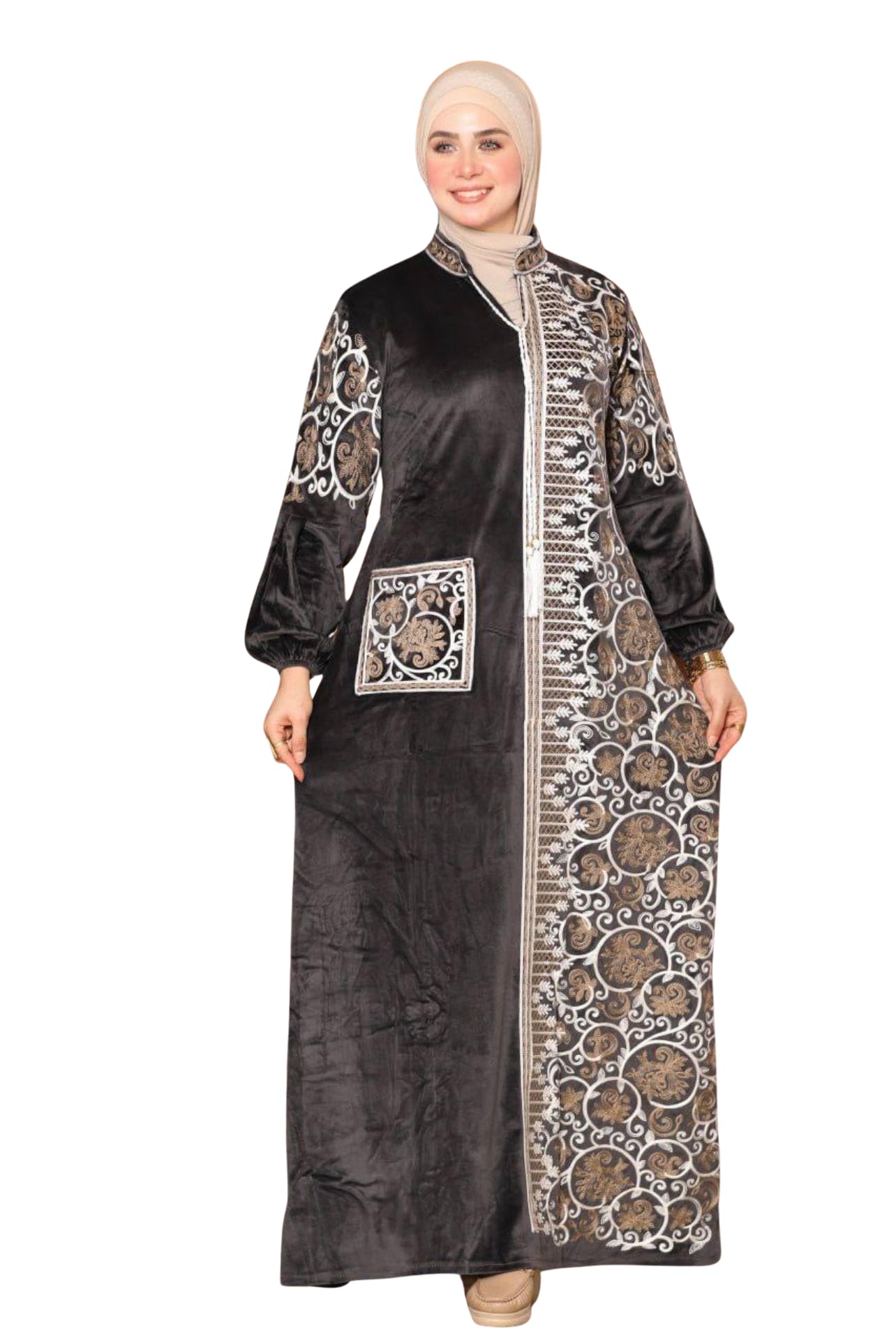 عباية شتوي قطيفة للمحجبات – تطريز أنيق بطول العباية مع جيب مطرز – تصميم محتشم واسع – مقاسات كبيرة من 65 حتى 120 كيلو