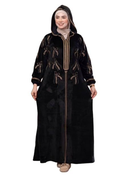 عباية شتوي قطيفة هايدي فاخرة للمحجبات – تطريز أنيق بكم واسع وغطاء رأس – خامة معالجة ضد الانكماش – مقاسات كبيرة من 65 حتى 120 كيلو