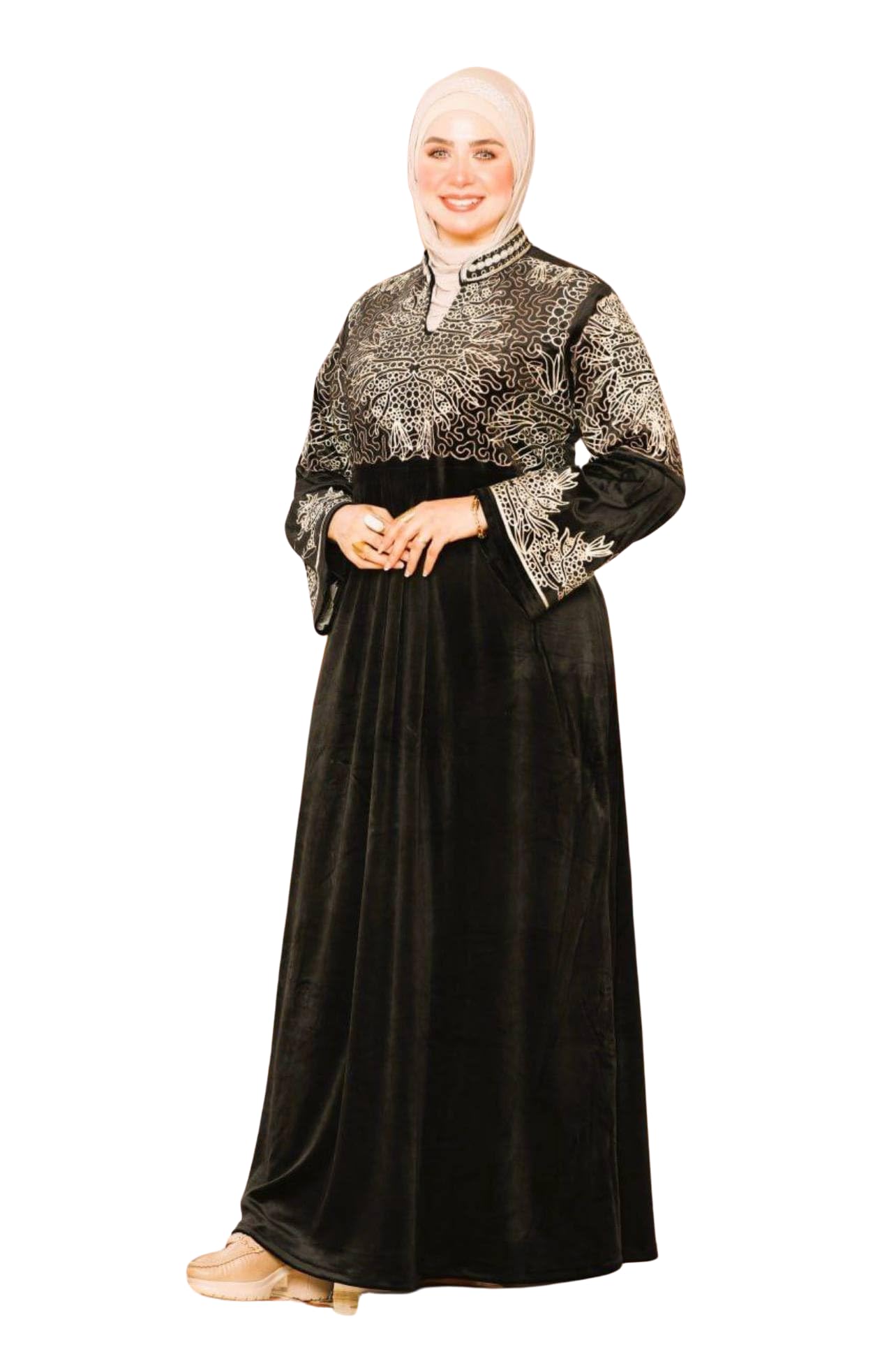 عباية للنساء مصنوعة من المخمل، مطرزة على الصدر والأكمام، مناسبة للوزن من 29.5 حتى 63.5 كجم، بتصميم أنيق للمحجبات