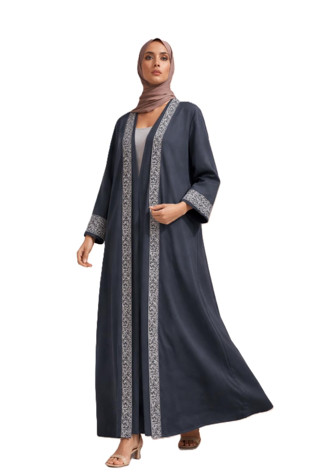 عباية نسائية طويلة مفتوحة بتطريز أنيق على الحواف والأكمام، تصميم عصري محتشم، خامة ناعمة وخفيفة، مناسبة للمناسبات والإطلالات اليومية