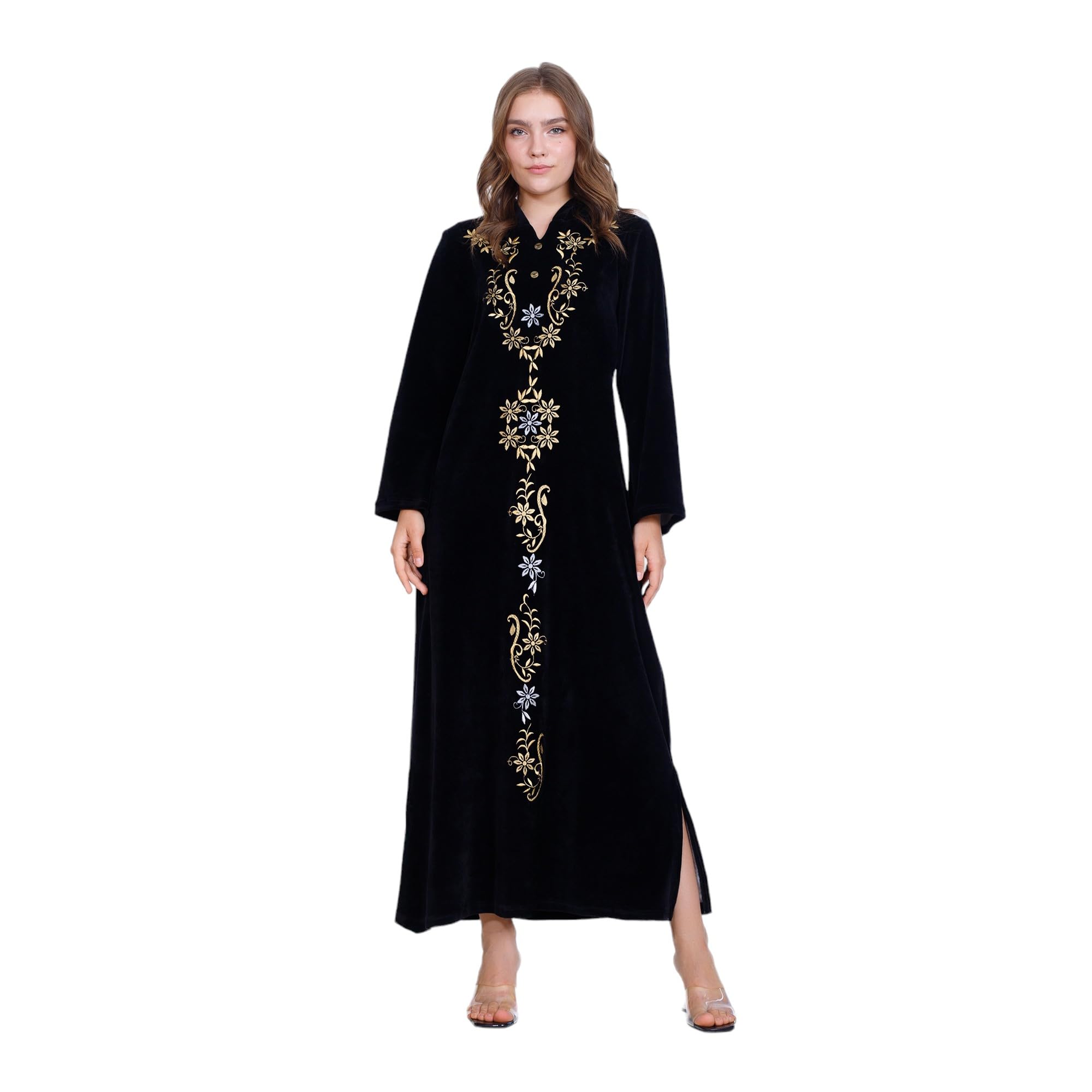 عباية نوم شتوية من القطن والقطيفة بقصة خاصة على الجانبين ومطرزة بلون ذهبي من الأمام، فستان منزلي طويل ومريح للارتداء من زيكوتكس