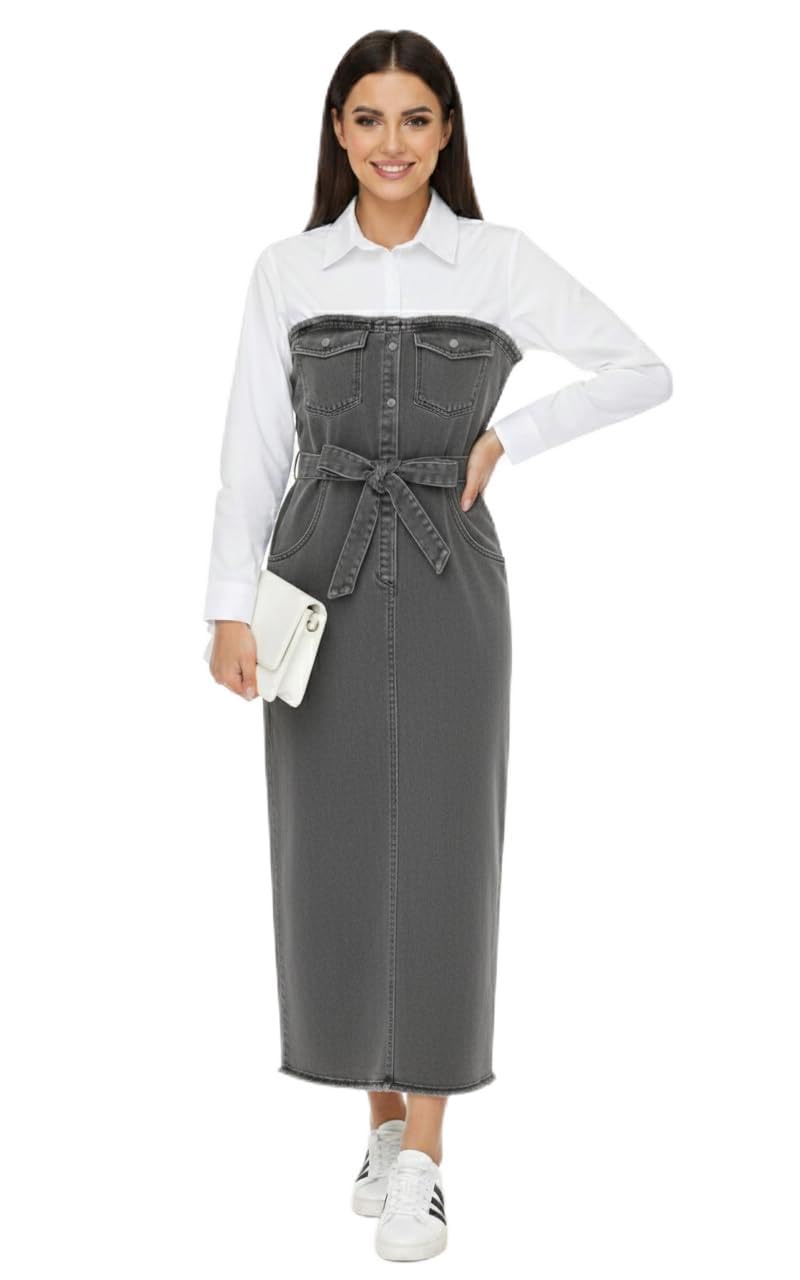 فستان جينز نسائي مصنوع من الدينيم، للنساء، بتصميم مطاطي ومرن، مع حزام من الوسط، باللون الأبيض، مقاس 2