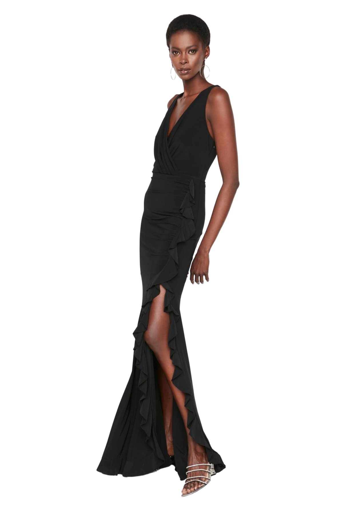 فستان سهرة طويل أنيق محبوك بتفاصيل من الأحجار السوداء للنساء TPRSS23EL00509 فستان سهرة وفستان تخرج من ترنديول