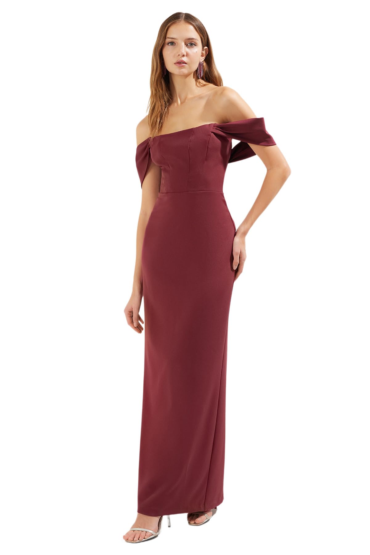فستان سهرة طويل منسوج بياقة كارمن بلون بورغندي TPRSS25AE00008