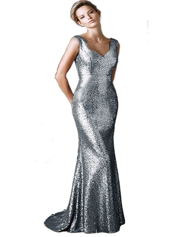 فستان سهرة نسائي فضي لامع مزين بالترتر مع بطانة بدون اكمام.