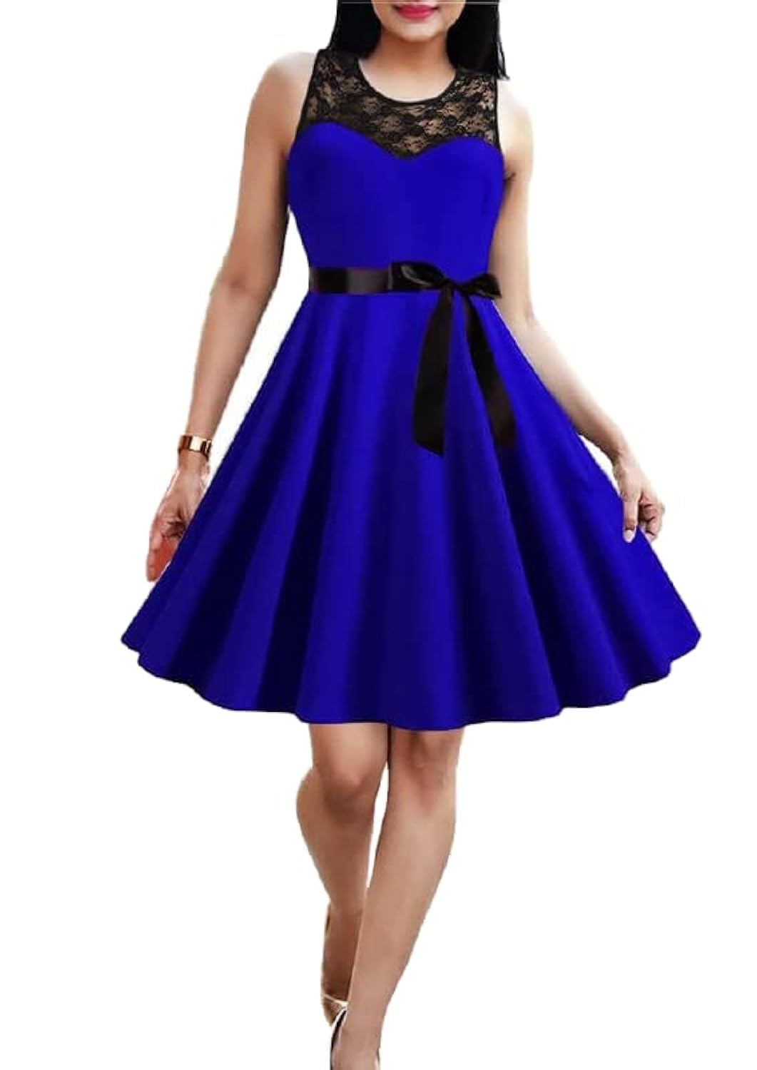 فستان نسائى اسكوبا مزين بدانتيل اسود معاة حزام ستان اسود