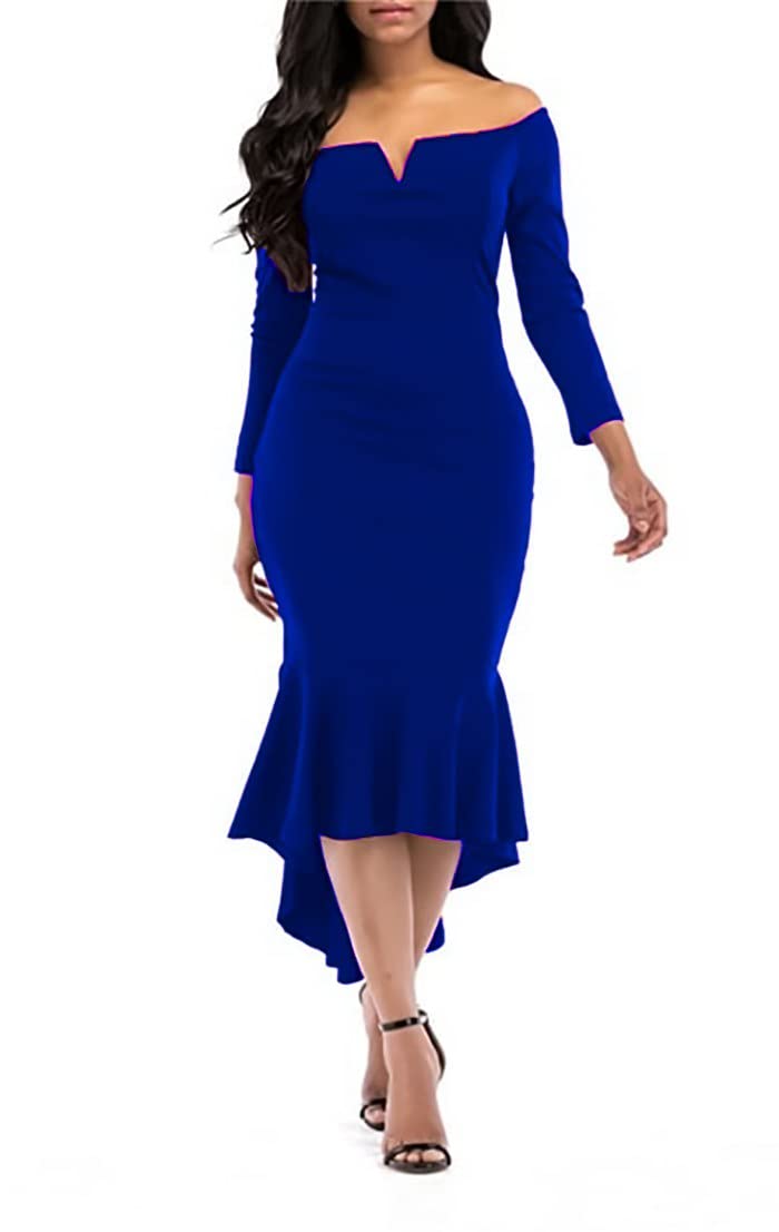 فستان نسائى طويل ازرق دون اكتاف