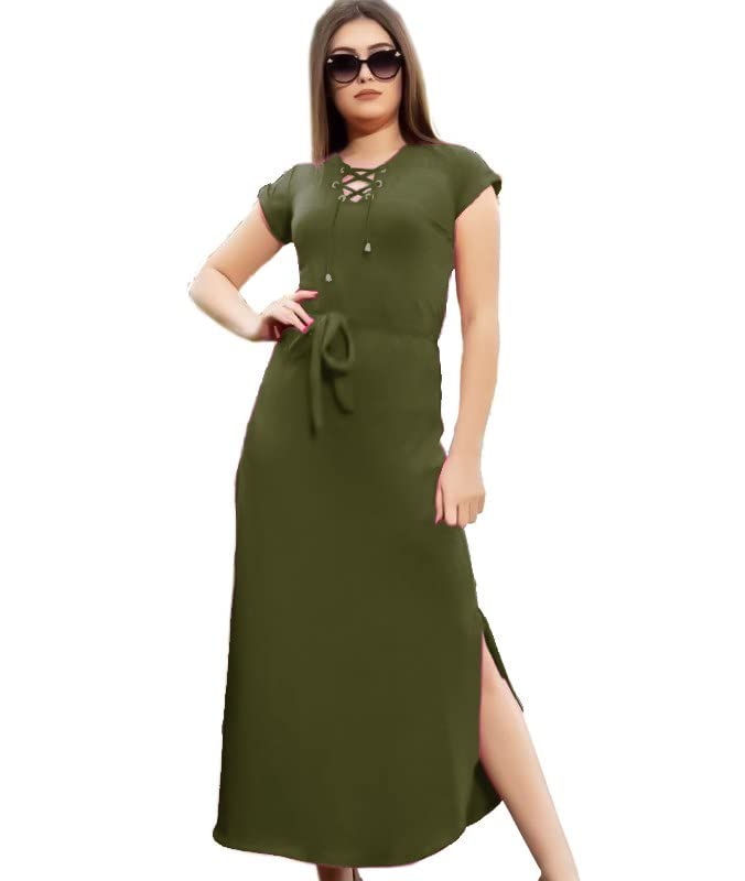 فستان نسائى نص كم بفتحة جانبية لون زيتي