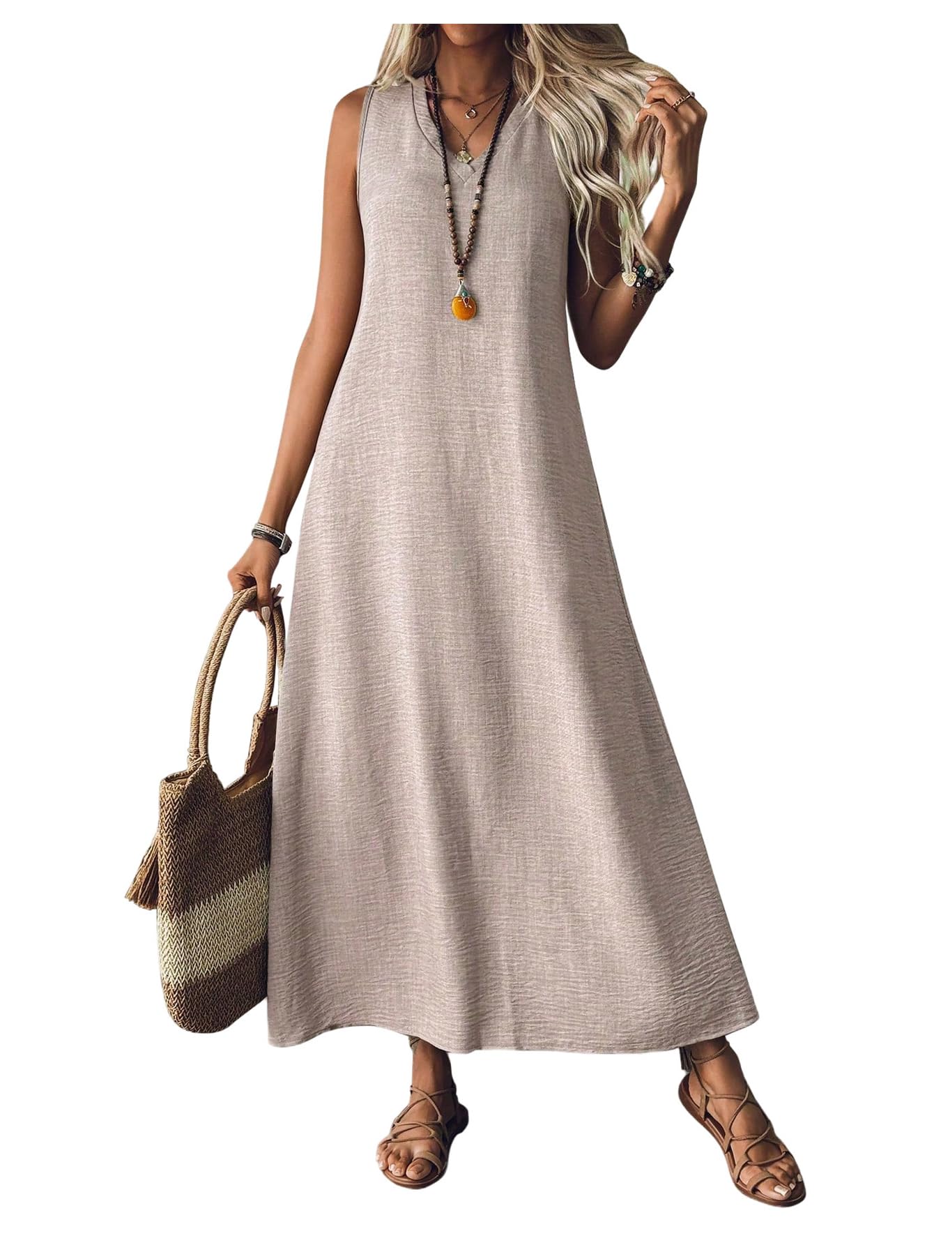 فستان نسائي طويل فضفاض بقصة ايه لاين وقبة V بدون اكمام من جورجليتر، فساتين صيفية بدون اكمام
