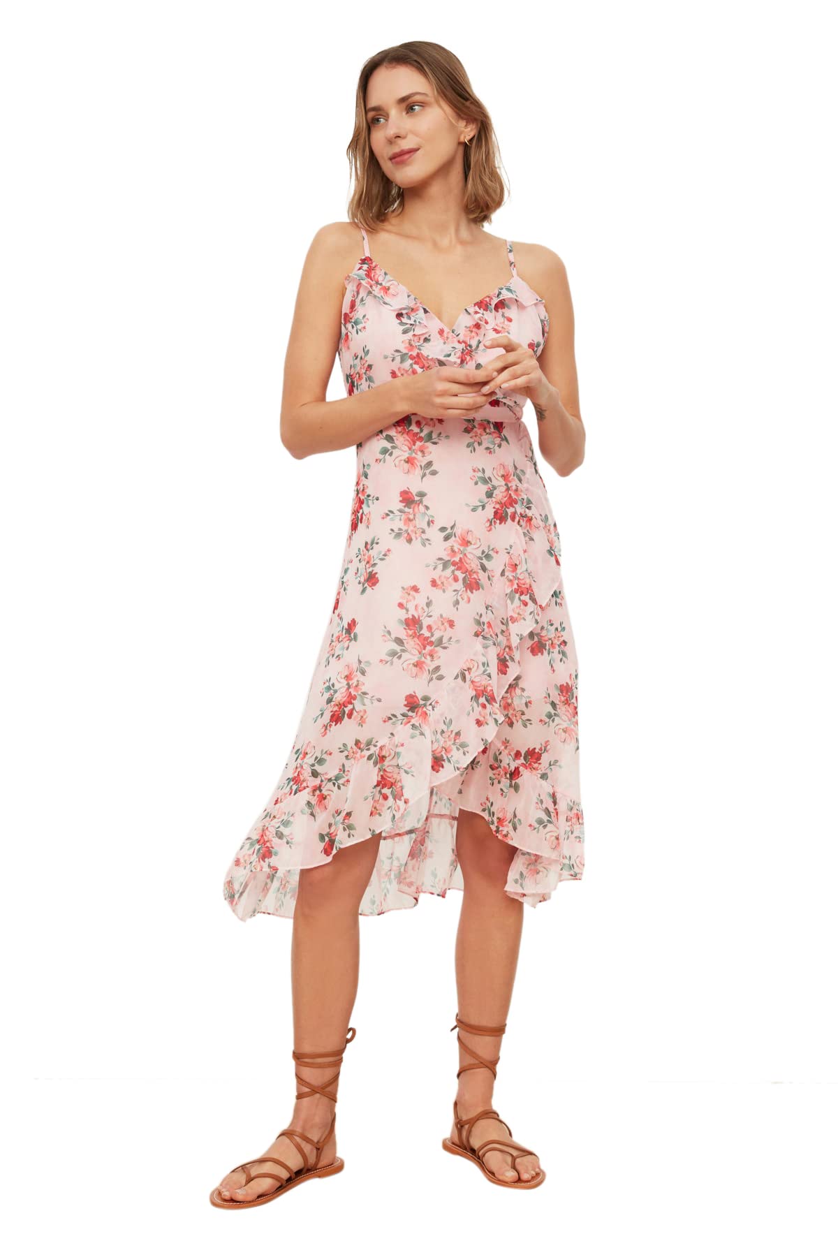 فستان نسائي منسوج مبطن TWOSS19EL0375 من الشيفون بحمالات وتفاصيل كشكشة وصدرية مزدوجة مع طبعة زهور من ترينديول، وردي (Powder)