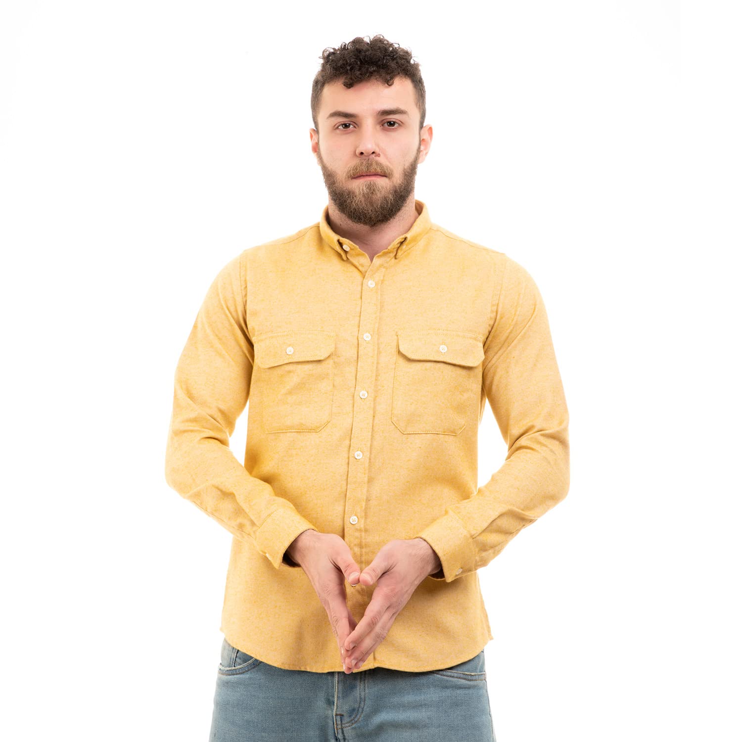 قميص شتوي بأزرار كاملة وجيوب على الصدر للرجال من اندورا – أصفر مسطردة فاتح