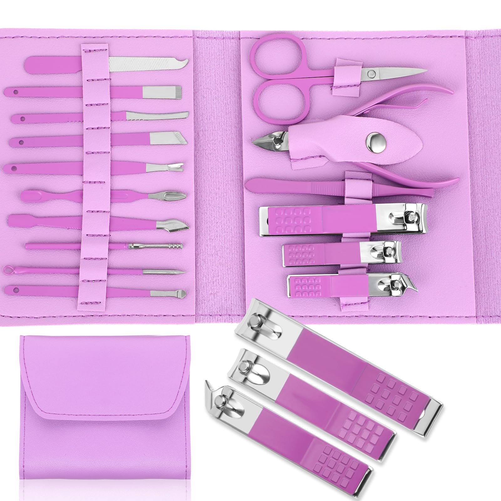مجموعة العناية بالأظافر الاحترافية للمونيكر والباديكر مكونة من 16 قطعة، أدوات الشخصية الفولاذ المقاوم للصدأ مع حافظة جلدية فاخرة للسفر للأظافر السميكة كيانيو، هدية للرجال والنساء، أرجواني