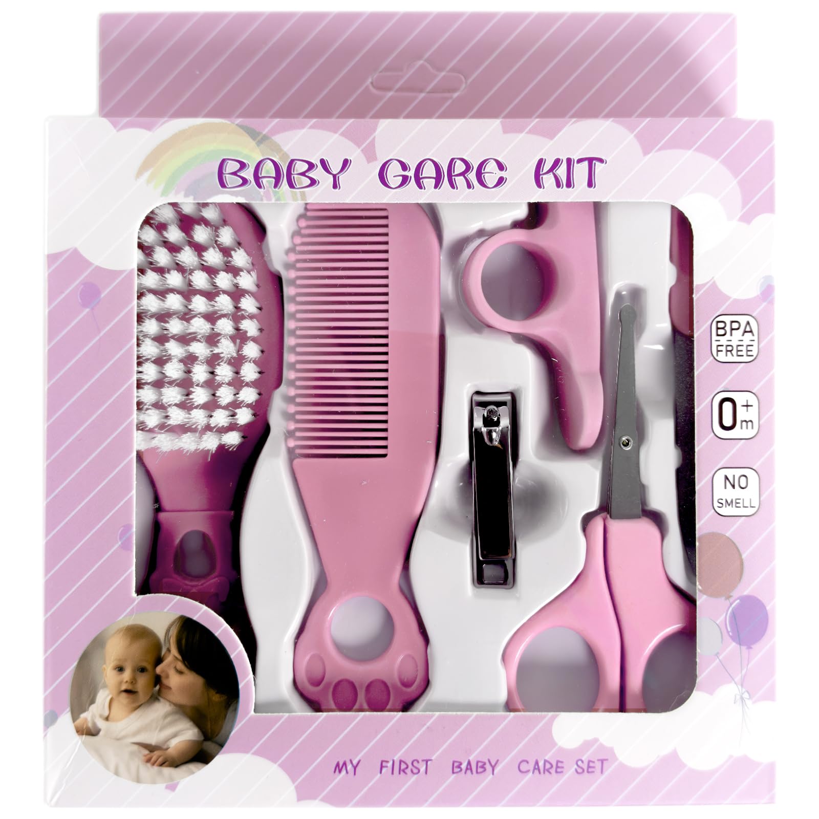 مجموعة العناية بالطفل – لحديثي الولادة، مجموعة العناية بالاظافر مكونة من 6 قطع، تتضمن قصافة اظافر وفرشاة شعر ومشط ومقص ومبرد اظافر ومجموعة العناية باظافر الاطفال مع شنطة تخزين (بينك)