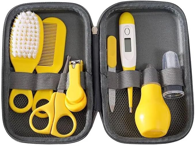 مجموعة العناية بالطفل مكونة من 8 قطع مع شنطة تخزين، مجموعة العناية اليومية الأساسية لحديثي الولادة والرضع والأطفال الصغار، مثالية لاحتياجات الرعاية الصحية في المنزل والسفر (لون أصفر)