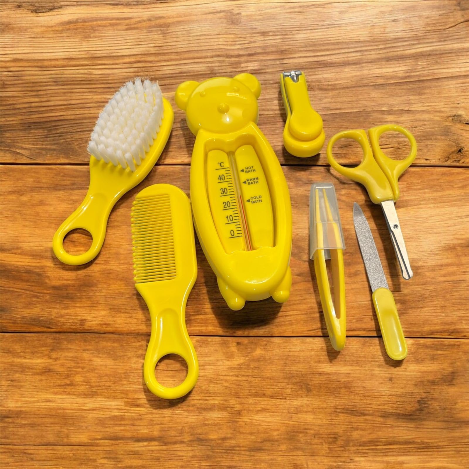 مجموعة العناية بالطفل 7 في 1 – مجموعة الشخصية والعناية الصحية لحديثي الولادة | تتضمن قصافة أظافر ومقص ومشط وفرشاة ناعمة وشفاط أنف ومقياس حرارة للماء | آمنة وخالية من مادة البيسفينول أ (أصفر)