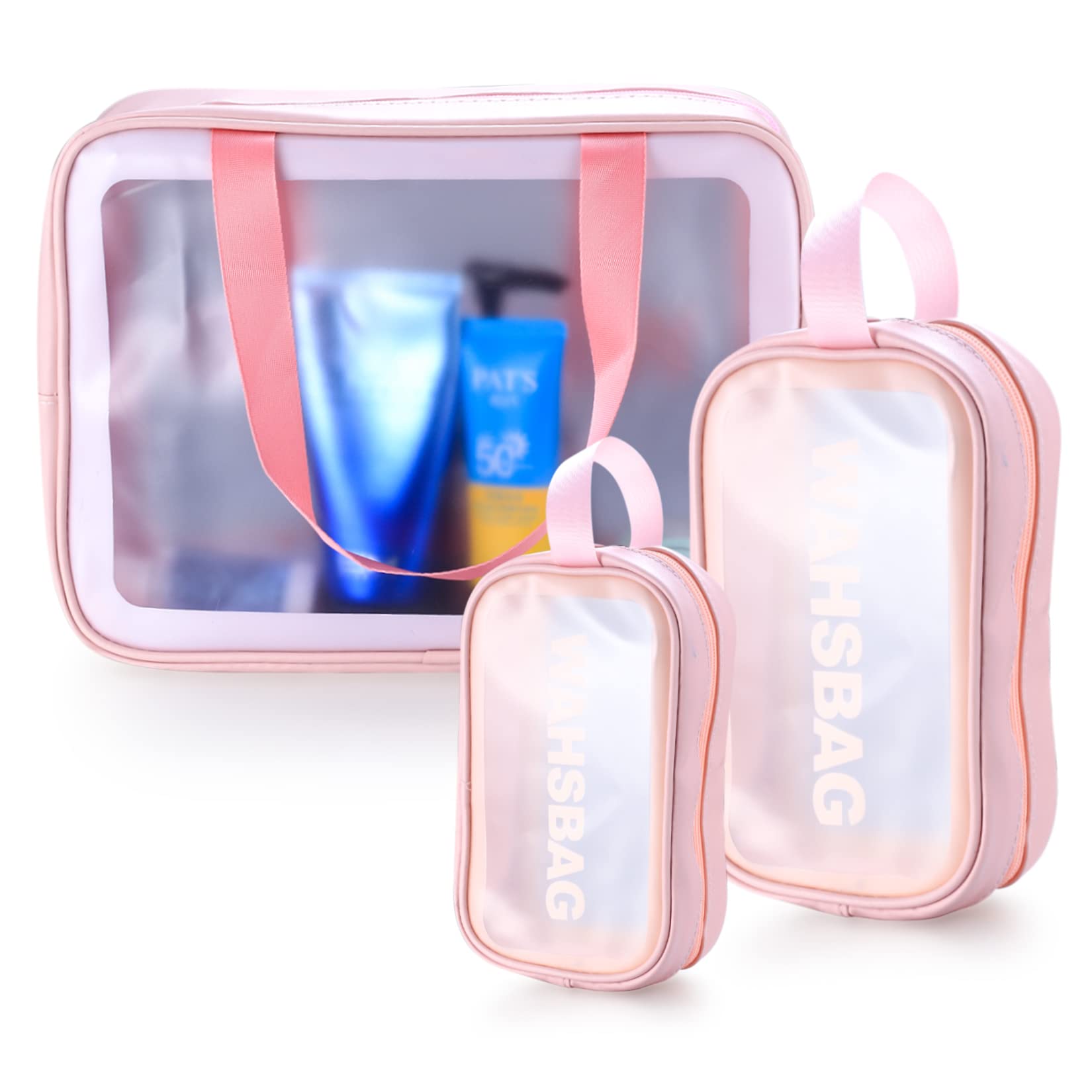 مجموعة شنط أدوات التجميل للسفر مستحضرات شفافة ومقاومة للماء شنطة مكياج محمولة منظم لأدوات العناية الشخصية للرجال والنساء والأطفال مناسب طقم من 3 قطع بلون وردي بلاستيك بي في سي كيابوغ