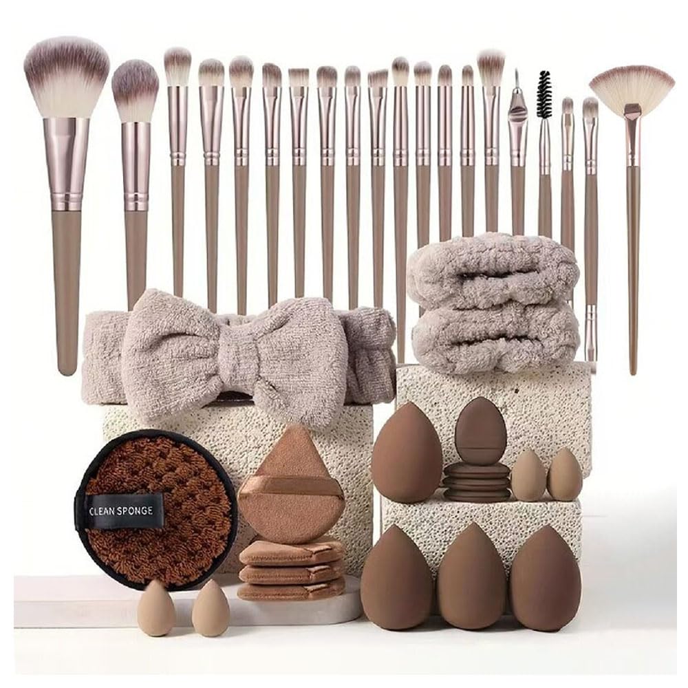 مجموعة فرش مكياج احترافية مع إسفنجة مكياج ووسادة بودرة وشريط رأس لغسل الوجه وأساور معصم وفرش مكياج للسفر للنساء والفتيات من جوديرن، بني، 40 قطعة