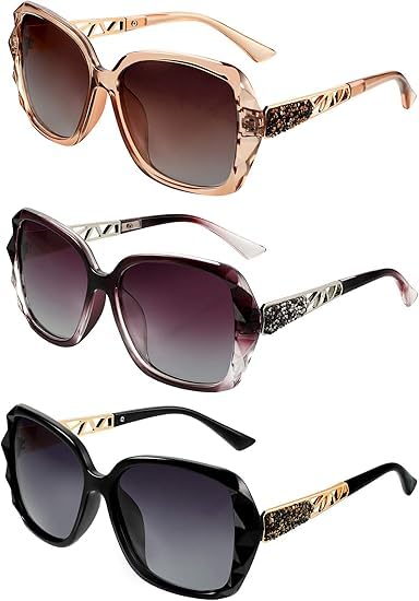 نظارات شمسية مستقطبة كبيرة الحجم للنساء من 3 قطع اطار مركب لامع – احجار الراين الكلاسيكية حماية الاشعة فوق البنفسجية اسود عدسات رمادية